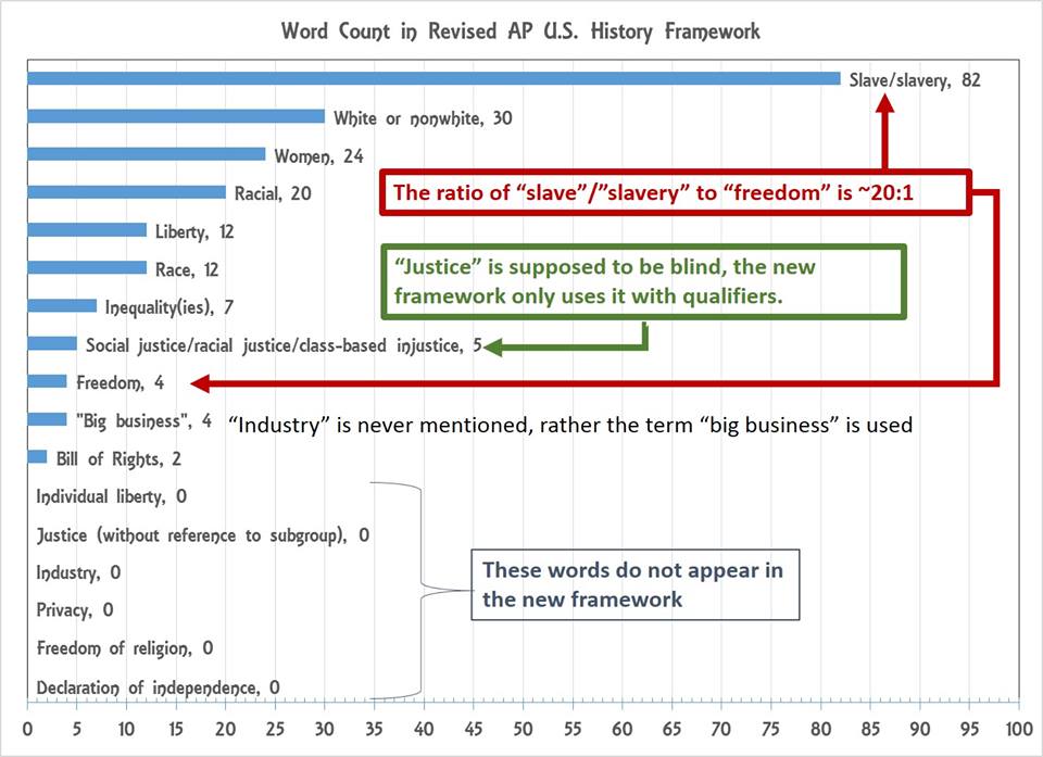 California Mom, Mary Litwinski, went through the new AP US History framework document and did a word count on several different words to give an indicator of what is given priority and what takes a back seat. Then she plotted it in Excel.  She stated…  Have a look The more I see about the way our educators are teaching “history”, the more I realize that we won’t even recognize our own country in 20 years if there is not significant push-back from parents and teachers.”